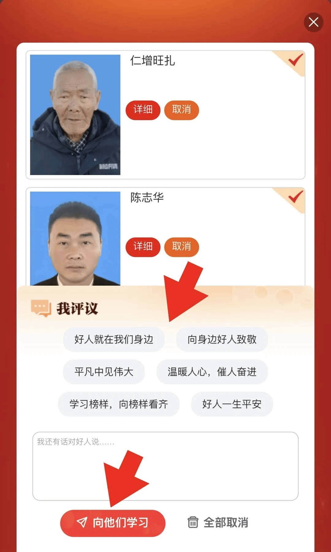 6、选中您要评议的内容,点击“向他们学习”按钮即可。