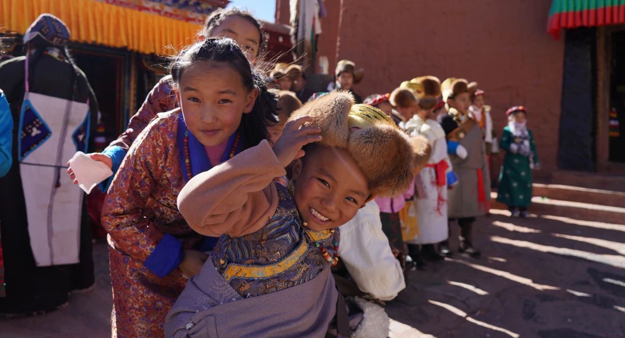 对于普兰新年的由来,今年71岁的苏玛加介绍道,普兰新年与当地的气候变化有关,藏历十一月一日,白天渐长、气温回暖,故而成为新年之始,遵循着自然与生活的节律。新年期间,丰富多彩的民俗活动也成了这里的独特风景。为你带来吉祥,给予我礼物,为我的五彩经幡旗插上一片经幡,为你带来幸福如意……”在藏历十月二十九、三十两日,孩子们身着新衣,背着装零食和压岁钱的小包,结伴穿梭在乡间小道,挨家挨户唱着古老的萌彩歌谣,讨要自己的新年礼物。