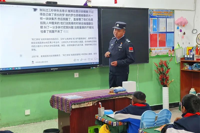 近期,西藏阿里边境管理支队塔尔钦边境派出所关注到有学生家长在网上反映“死亡游戏”再现校园,为预防辖区发生学生人身伤害事故,维护学生和学校的安全稳定。塔尔钦边境派出所根据社会热点信息和工作安排部署,前往巴嘎乡小学组织开展安全教育活动。
