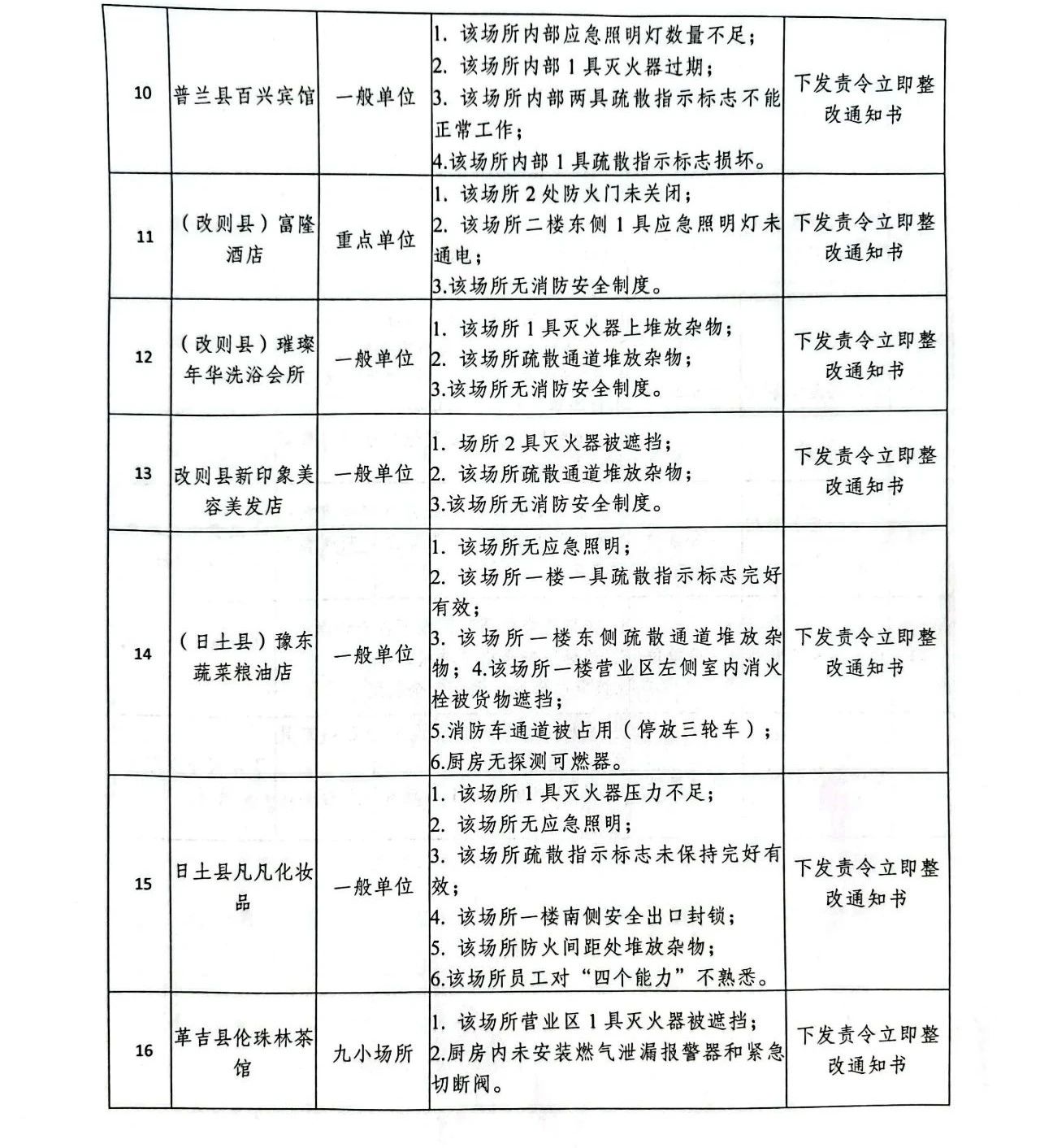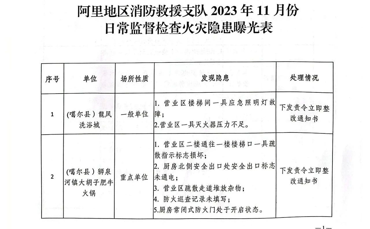 近日,阿里地区消防救援支队在“119宣传月“活动开展过程中,发现部分存在火灾风险的单位,为督促相关单位提高消防安全意识,落实整改主体责任,及时消除火灾隐患,现对这几家单位进行曝光: