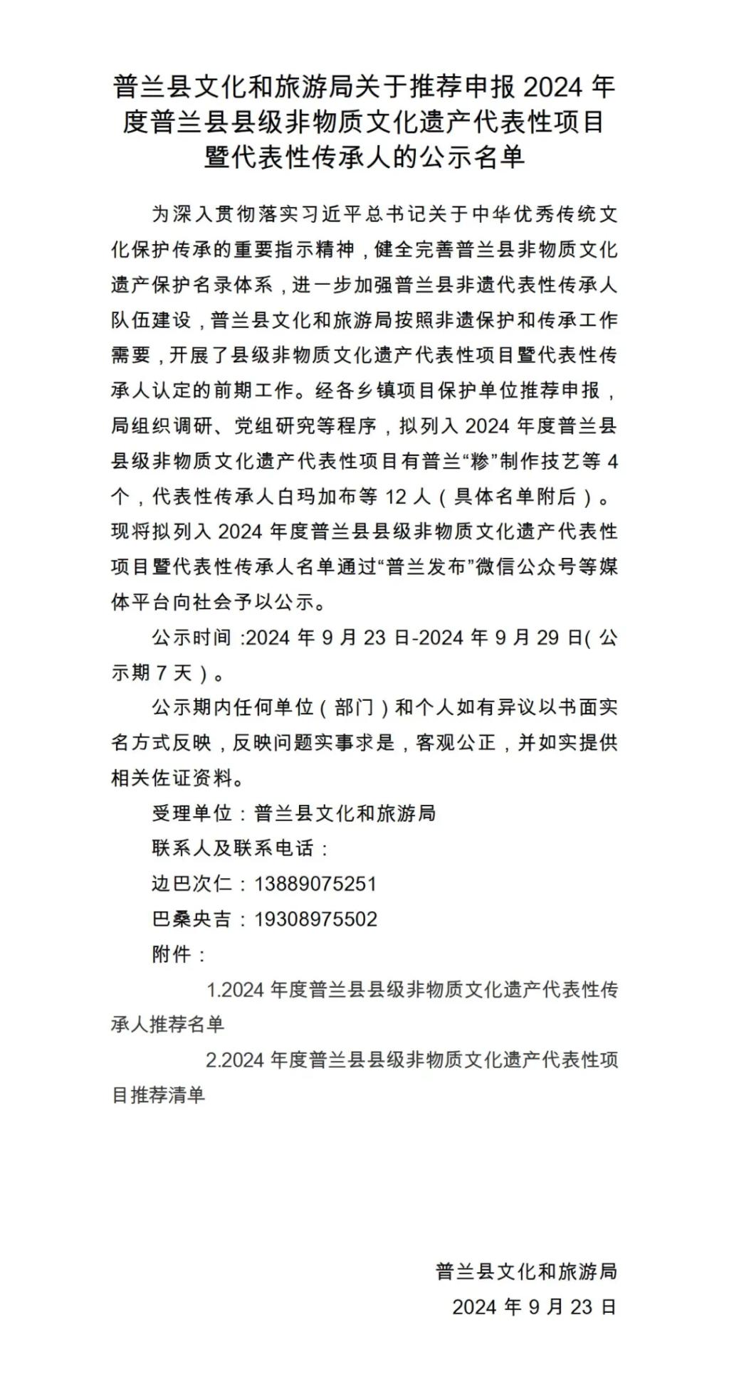 附件:1.2024年度普兰县县级非物质文化遗产代表性传承人推荐名单