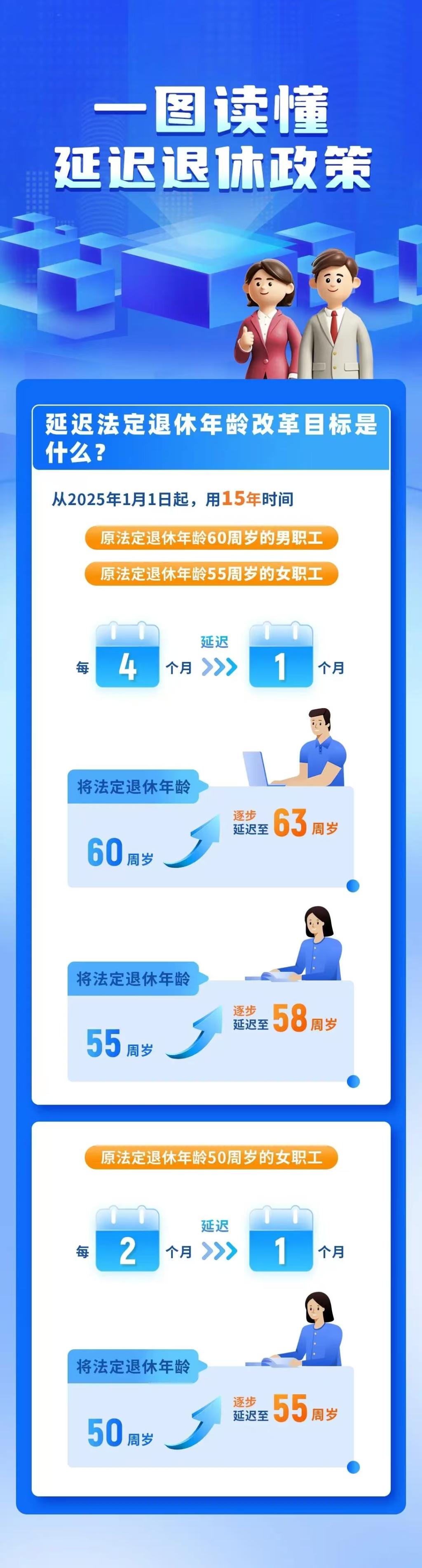 第十四届全国人民代表大会常务委员会第十一次会议通过了《关于实施渐进式延迟法定退休年龄的决定》,本决定自2025年1月1日起施行。男、女职工的法定退休年龄怎样调整?哪些渠道可以查询本人对应的法定退休年龄?弹性延迟退休是怎么规定的?一组图读懂↓↓↓