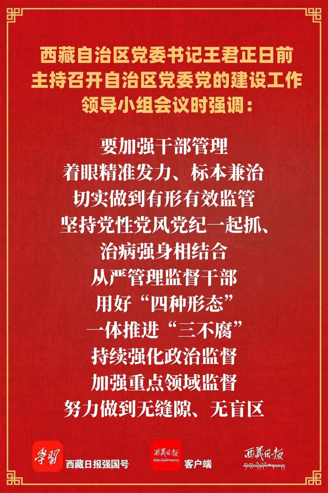 日前,自治区党委书记王君正主持召开自治区党委党的建设工作领导小组会议,传达学习习近平总书记在中央政治局集体学习时的重要讲话精神,听取自治区党委落实全面从严治党主体责任情况汇报,研究部署下一步工作。他强调,要认真贯彻落实新时代党的建设总要求,扛牢管党治党政治责任,纵深推进全面从严治党,持续巩固良好政治生态,为全面建设社会主义现代化新西藏提供坚强保障。
