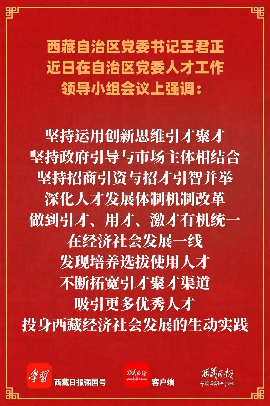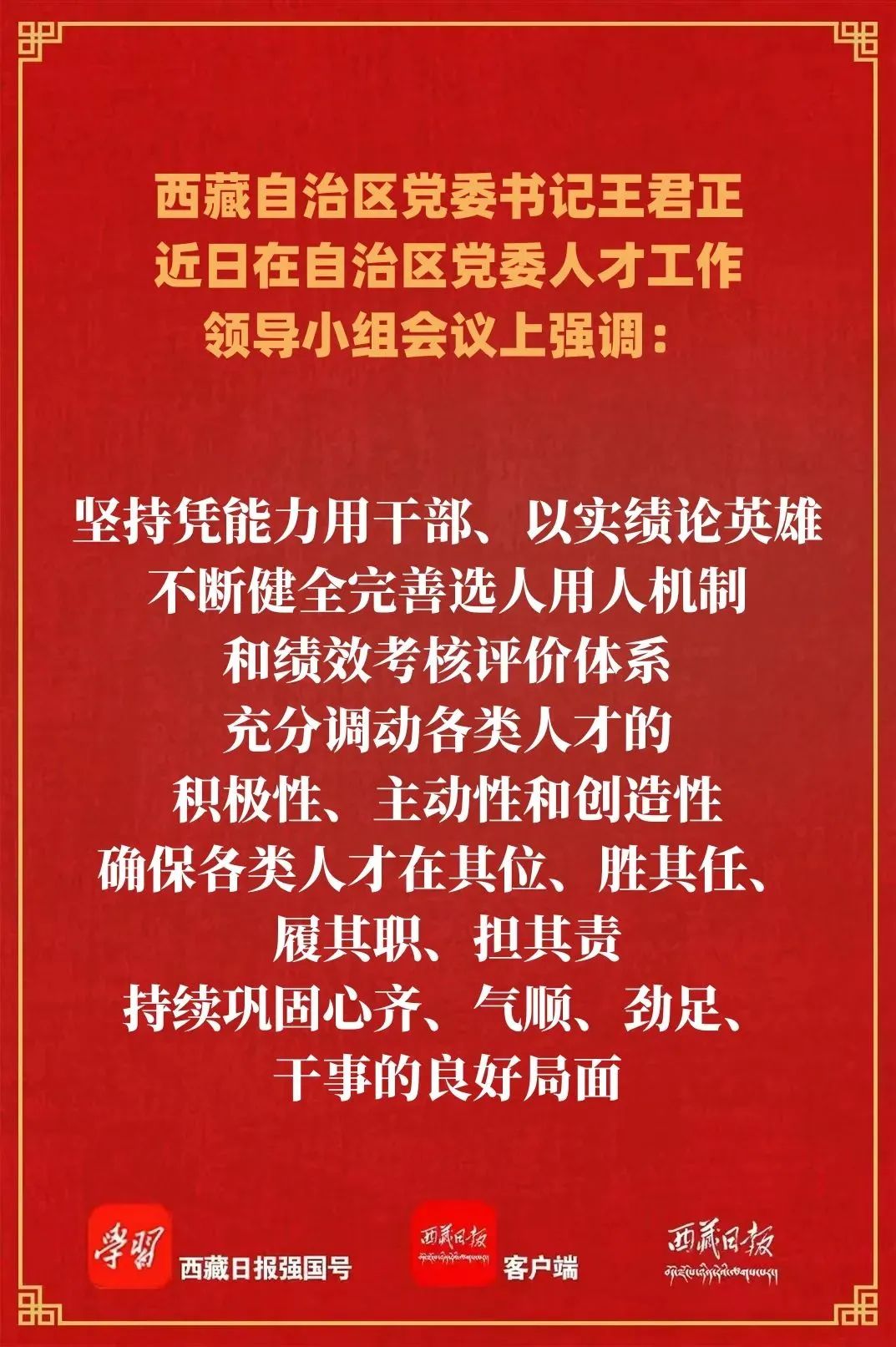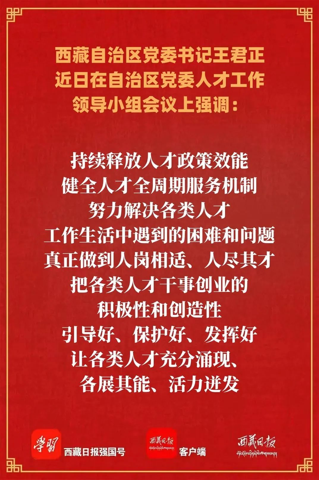 王君正强调,建设社会主义现代化新西藏,需要大批德才兼备的人才。全区各级各部门要深入贯彻落实习近平总书记关于做好新时代人才工作的重要思想,总结经验、巩固成果,大力实施人才强区战略,全方位培养引进用好人才,用心用情用力服务人才,为建设社会主义现代化新西藏提供有力人才支撑。强化“人才是第一资源”理念,落实好党管人才责任。人是生产力中最活跃的因素,人才是推动经济社会发展的重要力量,党的领导是做好人才工作的根本保证。要坚持把党的领导贯穿人才工作各方面全过程,把人才工作摆在突出位置,进一步完善党管人才的体制机制,不断改进党管人才方式方法,加强对人才的政治引领和政治吸纳,重视培养人才、团结人才、引领人才、成就人才,努力营造识才爱才敬才用才的良好环境,推动党的政治优势、组织优势转化为人才发展优势。强化以用为本理念,广开进贤纳才之路。坚持运用创新思维引才聚才,坚持政府引导与市场主体相结合,坚持招商引资与招才引智并举,深化人才发展体制机制改革,做到引才、用才、激才有机统一,在经济社会发展一线发现培养选拔使用人才,不断拓宽引才聚才渠道,吸引更多优秀人才投身西藏经济社会发展的生动实践。强化提质增效理念,搭建人才干事创业的舞台。坚持凭能力用干部、以实绩论英雄,不断健全完善选人用人机制和绩效考核评价体系,充分调动各类人才的积极性、主动性和创造性,确保各类人才在其位、胜其任、履其职、担其责,持续巩固心齐、气顺、劲足、干事的良好局面。强化服务至上理念,营造人尽其才的发展环境。持续释放人才政策效能,健全人才全周期服务机制,努力解决各类人才工作生活中遇到的困难和问题,真正做到人岗相适、人尽其才,把各类人才干事创业的积极性和创造性引导好、保护好、发挥好,让各类人才充分涌现、各展其能、活力迸发。