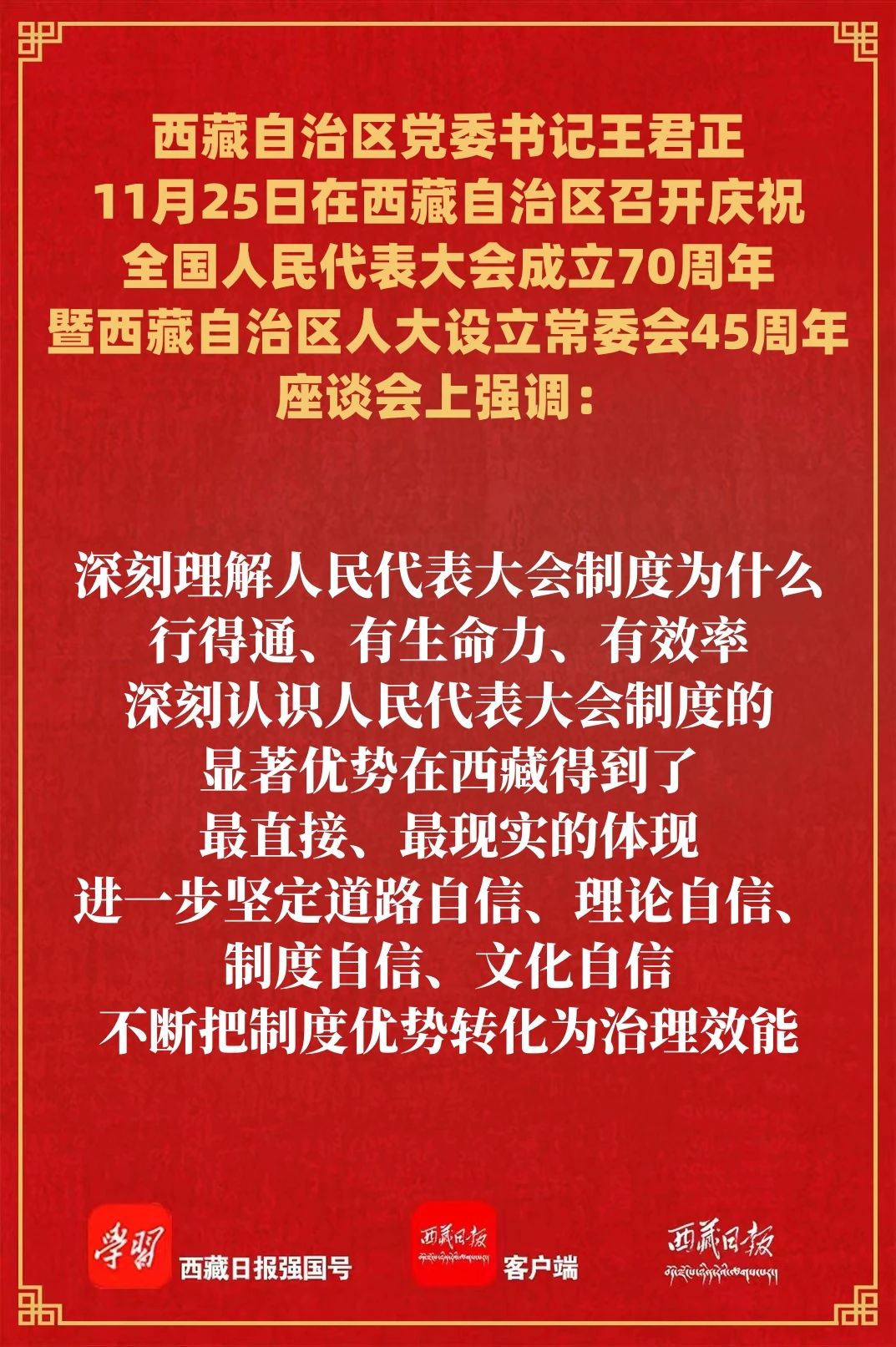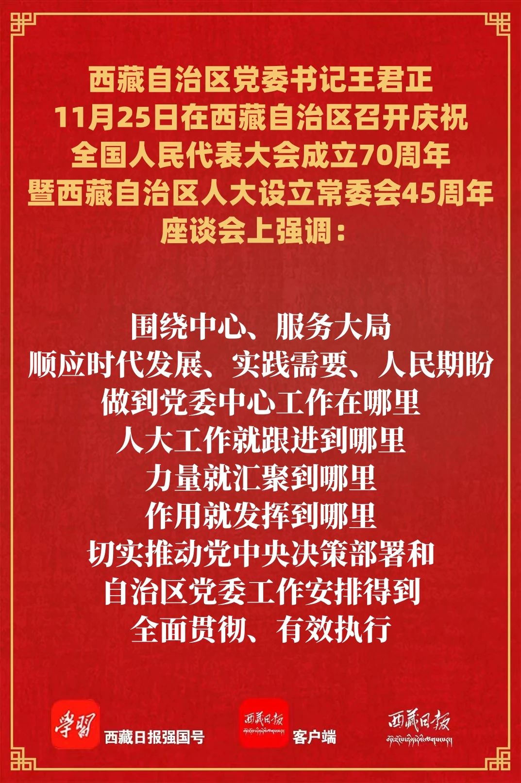11月25日,西藏自治区召开庆祝全国人民代表大会成立70周年暨西藏自治区人大设立常委会45周年座谈会。自治区党委书记王君正出席并讲话,强调要深入贯彻落实习近平总书记关于坚持和完善人民代表大会制度的重要思想,特别是要认真学习贯彻习近平总书记在庆祝全国人民代表大会成立70周年大会上的重要讲话精神,坚持党的领导、人民当家作主、依法治国有机统一,坚持好、完善好、运行好人民代表大会制度,为谱写中国式现代化西藏篇章贡献力量。