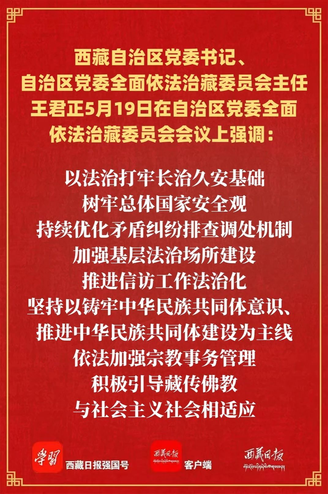 5月19日,自治区党委全面依法治藏委员会会议召开。自治区党委书记、自治区党委全面依法治藏委员会主任王君正主持并讲话。强调,要深入贯彻落实习近平法治思想,深刻把握法治建设新形势新任务新要求,努力建设更高水平的法治西藏,为长治久安和高质量发展打下坚实基础。