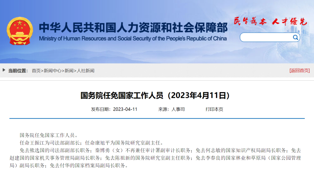 国务院任免国家工作人员。任命王振江为司法部副部长;任命康旭平为国务院研究室副主任。免去熊选国的司法部副部长职务;秦博勇(女)不再兼任审计署副审计长职务;免去何志敏的国家知识产权局副局长职务;免去赵建国的国家机关事务管理局副局长职务;免去陈祖新的国务院研究室副主任职务;免去李春良的国家林业和草原局(国家公园管理局)副局长职务;免去付华的国家档案局副局长职务。