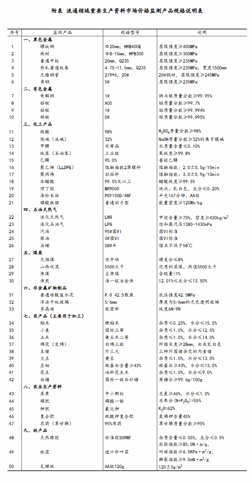 流通领域重要生产资料市场价格监测内容包括9大类50种产品的价格。类别与产品规格说明详见附表。