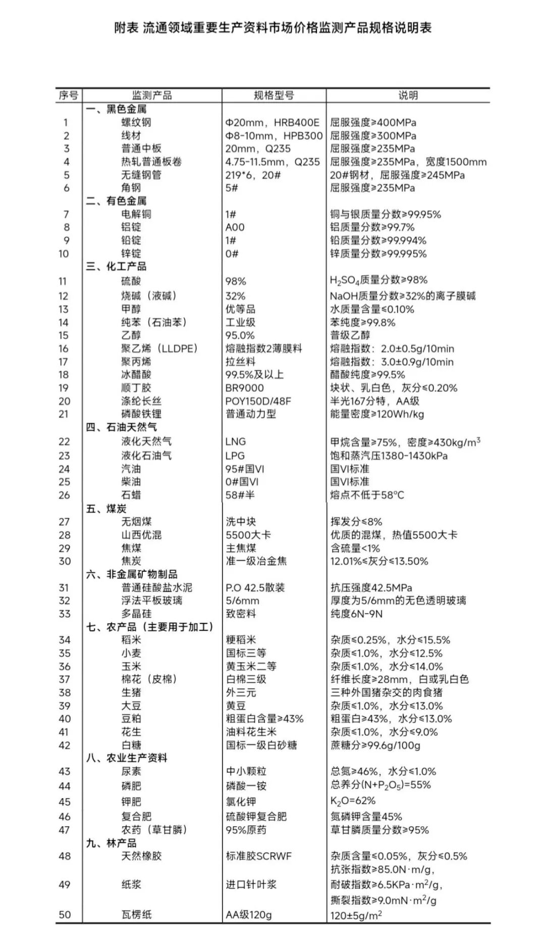 流通领域重要生产资料市场价格监测内容包括9大类50种产品的价格。类别与产品规格说明详见附表。