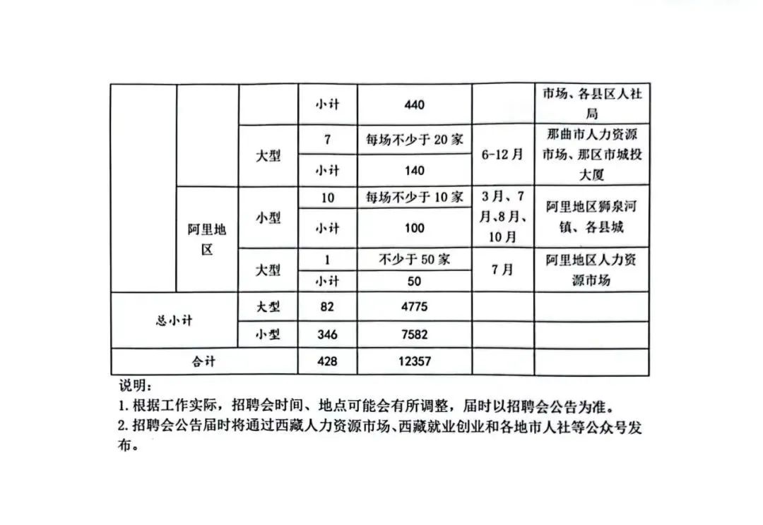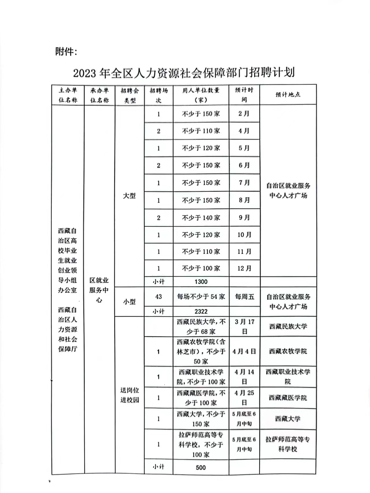 2023年由自治区、地(市)和县(区)人力资源和社会保障部门牵头,有计划的举办428场以上各类招聘会,并将及时在西藏人力资源市场、西藏就业创业和各地市人社部门等微信公众号发布招聘会相关信息。
