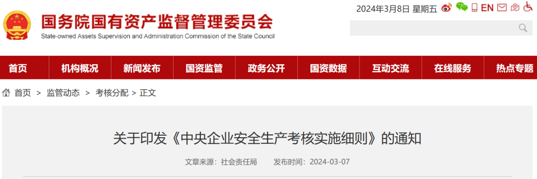 《中央企业安全生产考核实施细则》已经国务院国资委2024年第1次委务会审议通过,现印发给你们,请遵照执行。