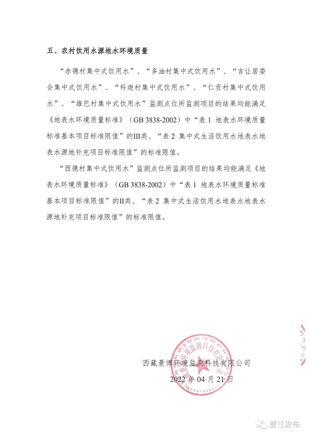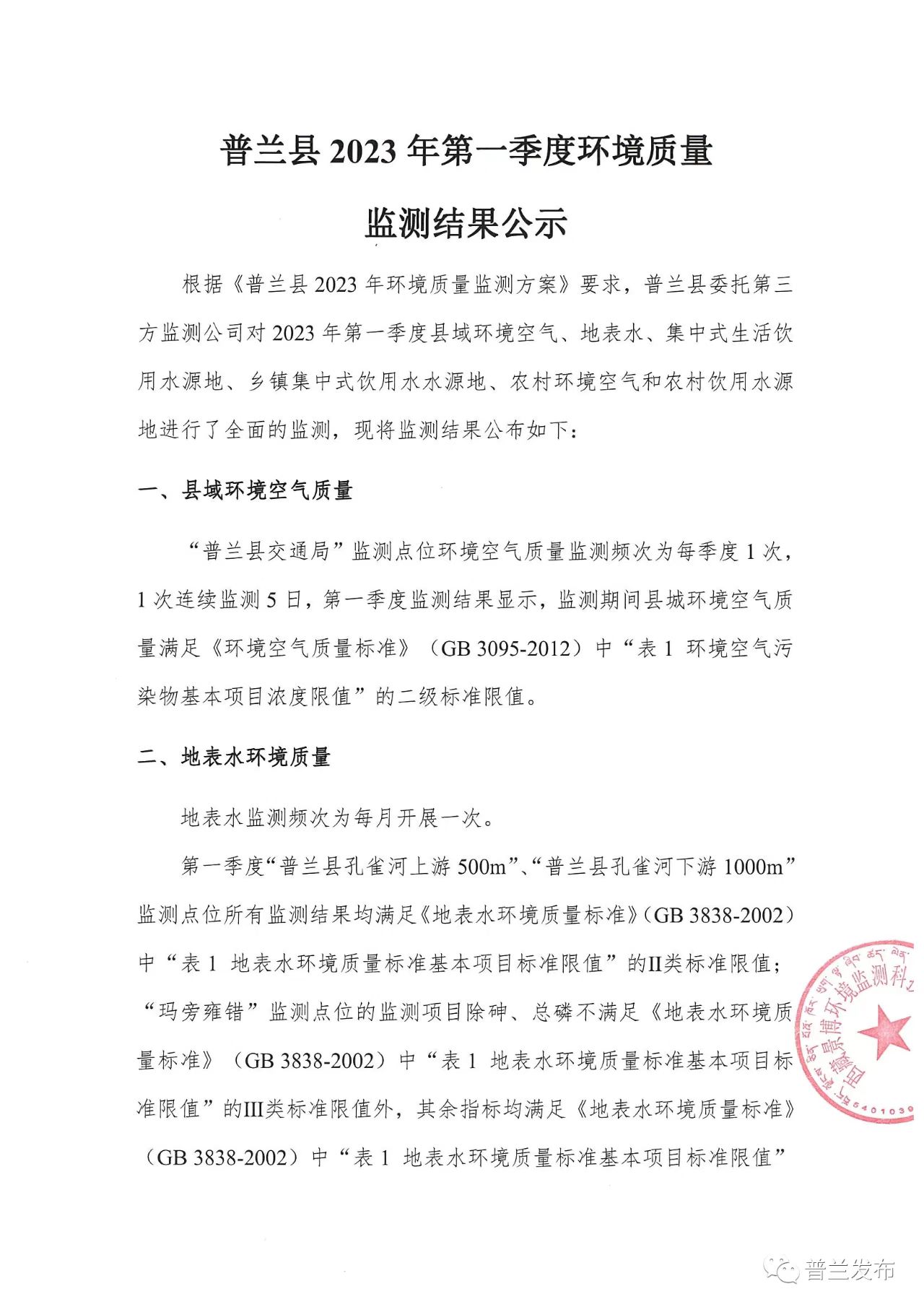 普兰县2023年第一季度环境质量检测结果公示