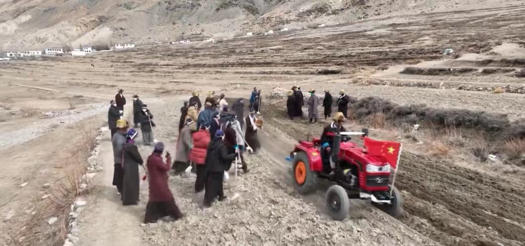 在普兰县科迦村的田间地头,伴随着拖拉机的轰鸣声,随处可见村民们穿着节日的盛装,鲜艳的五星红旗随着拖拉机在农田中来回穿梭,一眼望去满是热火朝天的春耕春播美好图景。犁地、播种、覆盖,各个环节有条不紊地进行着。