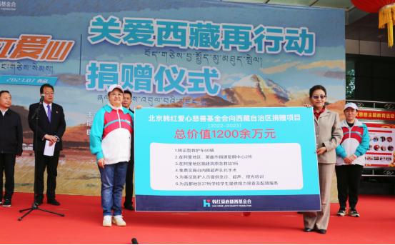 “韩红爱心·关爱西藏再行动”步履不停,2022至2023年,韩红基金会向西藏自治区共捐赠总价值1200余万元的项目与物资,包括:60辆转运型救护车,在阿里地区和那曲市捐建2所复明中心,在阿里地区捐建了1所高原急救站,为昌都地区37所学校学生提供视力筛查及配镜服务,同时将根据实际需求,针对急诊、超声、视光的基层医护人员开展培训。此次,“关爱西藏再行动”将开展为期9天的公益活动,“复明中心”项目邀请了浙医二院眼科专家将于阿里地区人民医院为当地患者免费开展白内障超乳手术。此外,还将对萨让乡、东汝乡卫生院进行急救室项目回访。