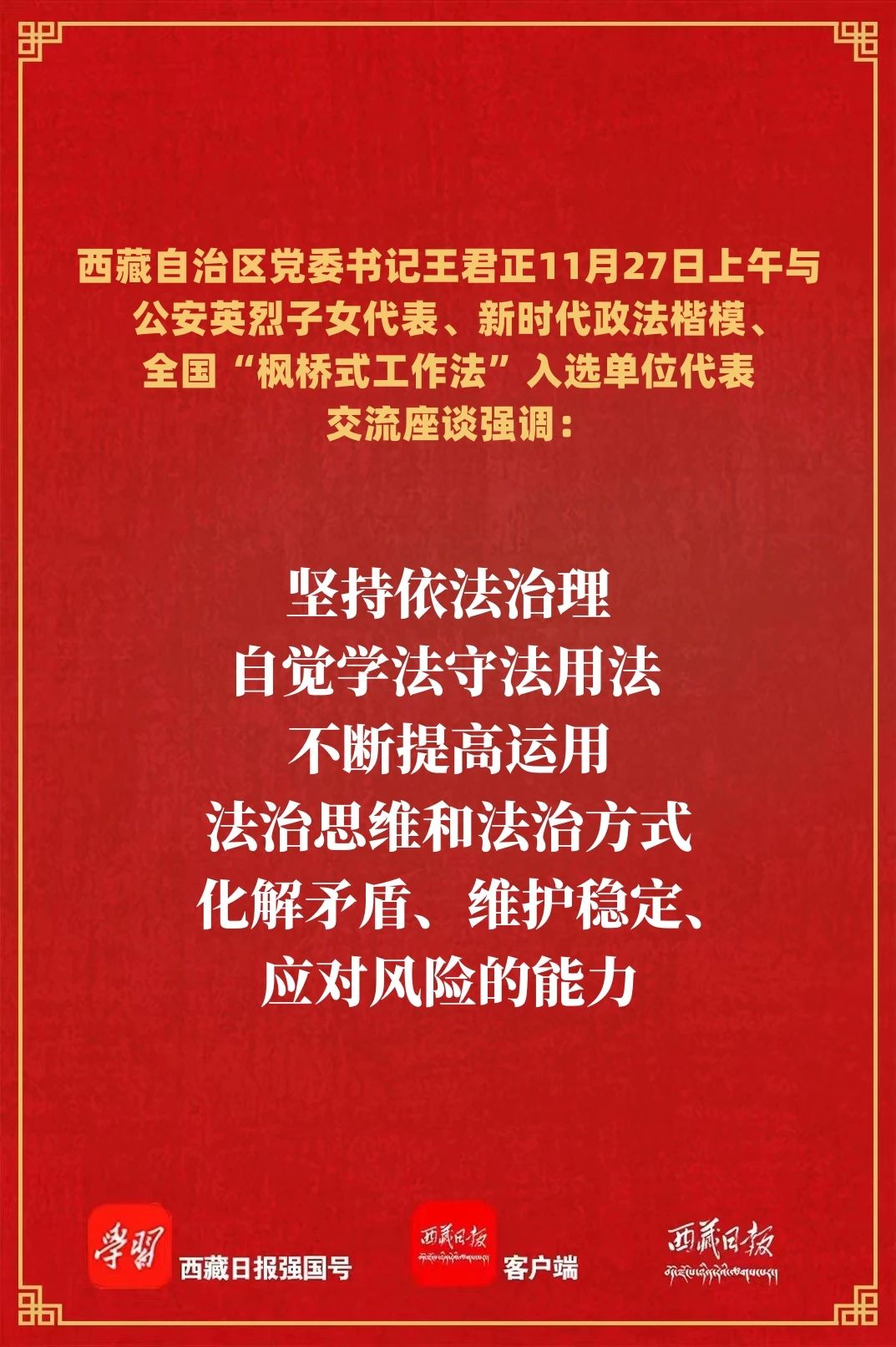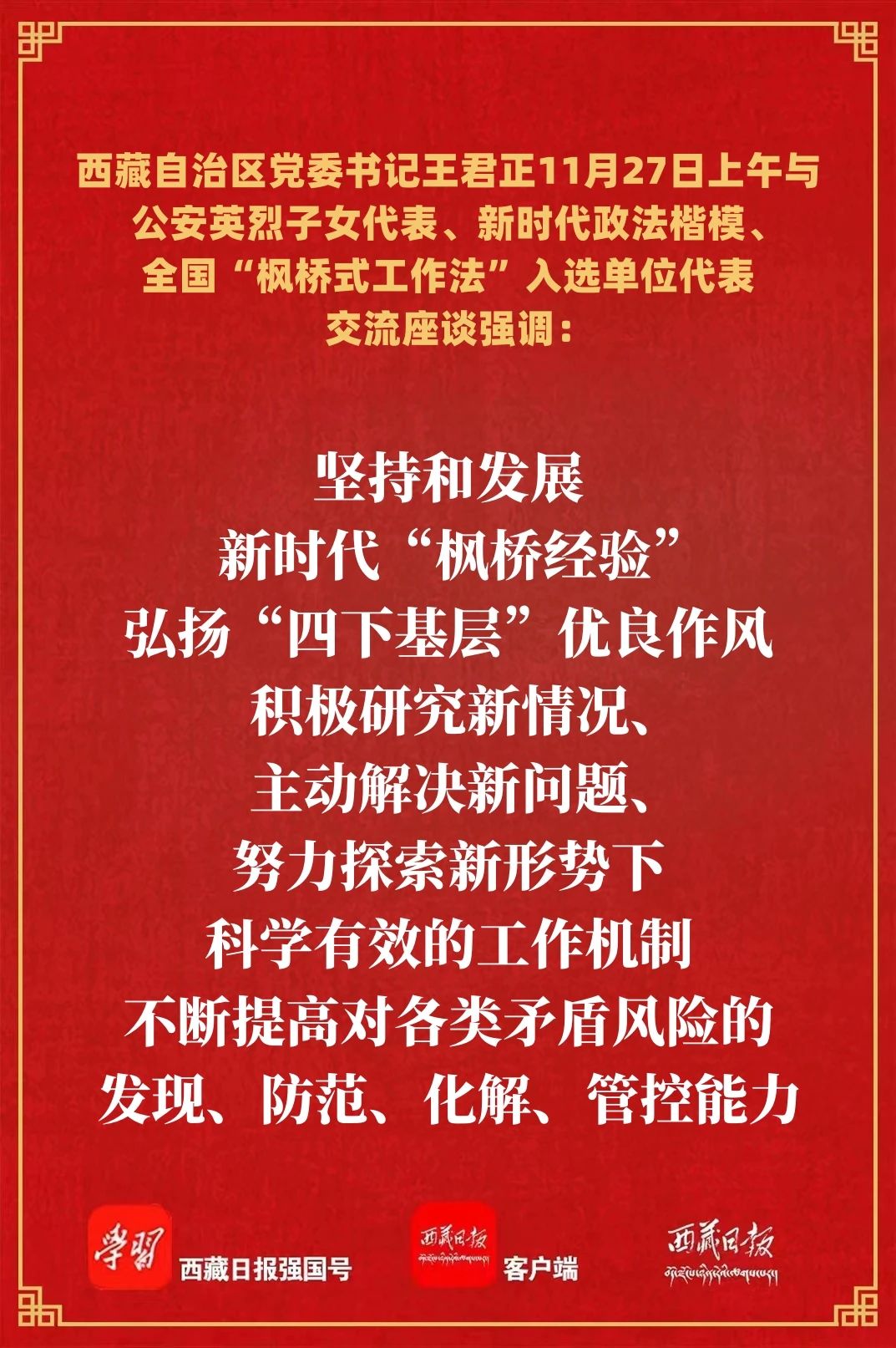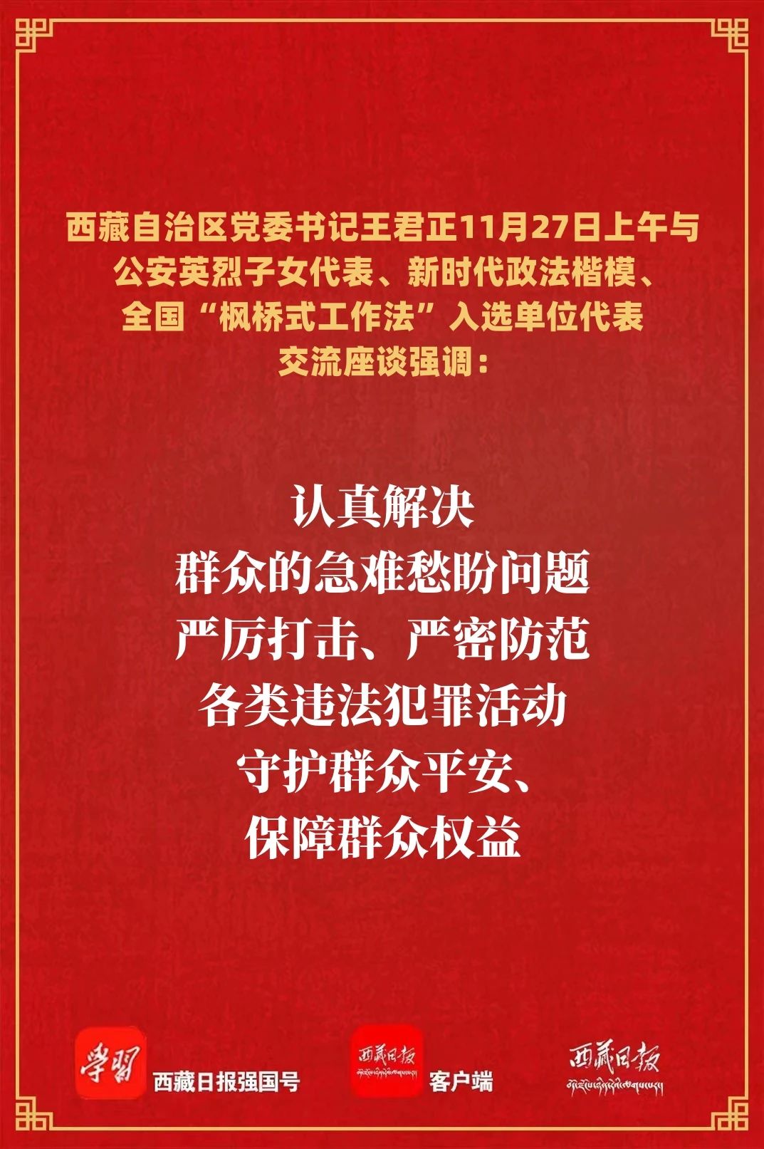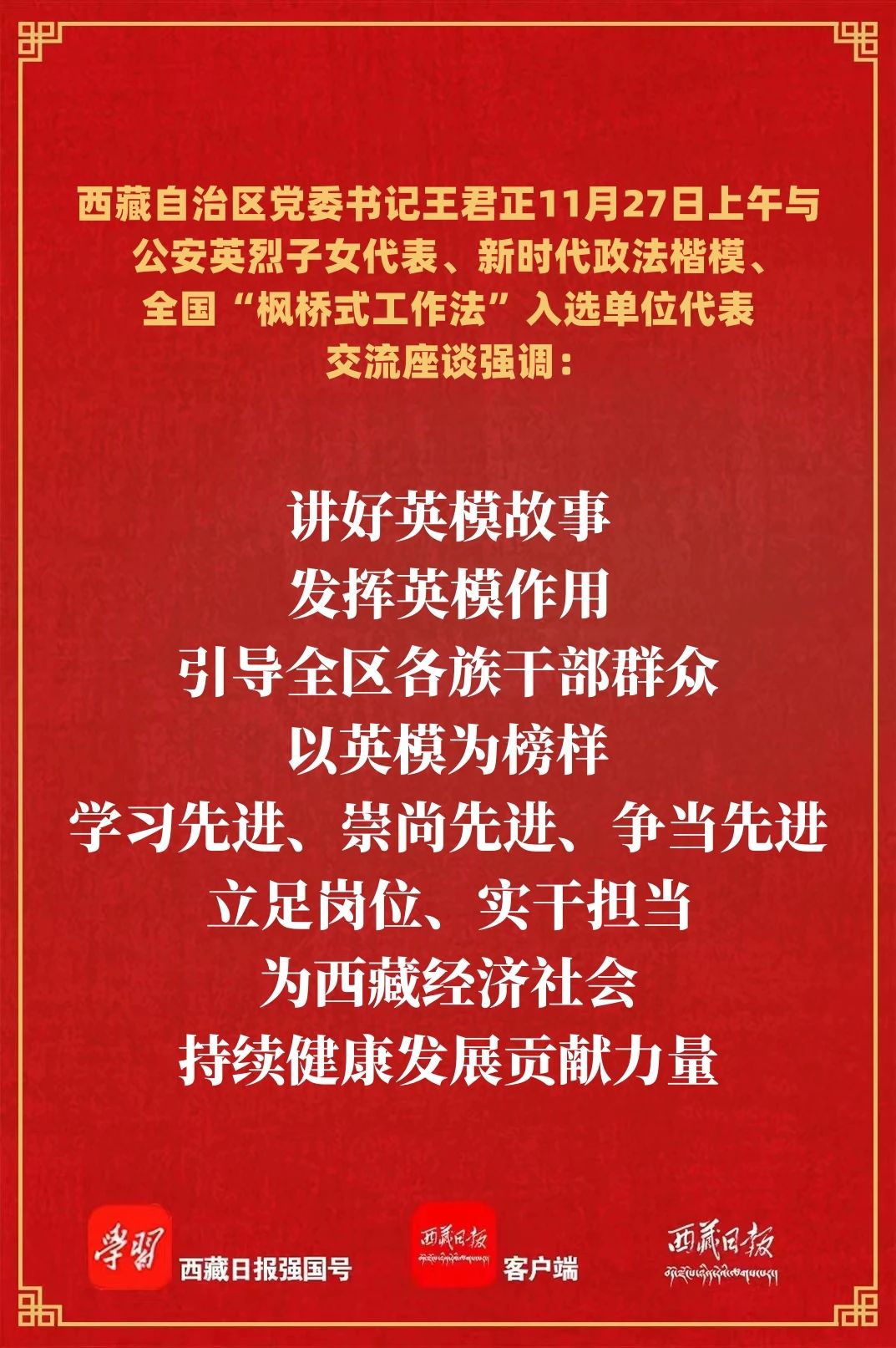 11月27日上午,自治区党委书记王君正与公安英烈子女代表、新时代政法楷模、全国“枫桥式工作法”入选单位代表交流座谈。他强调,要传承崇高精神、发扬优良作风、争取更大光荣,为推动西藏长治久安作出新贡献。