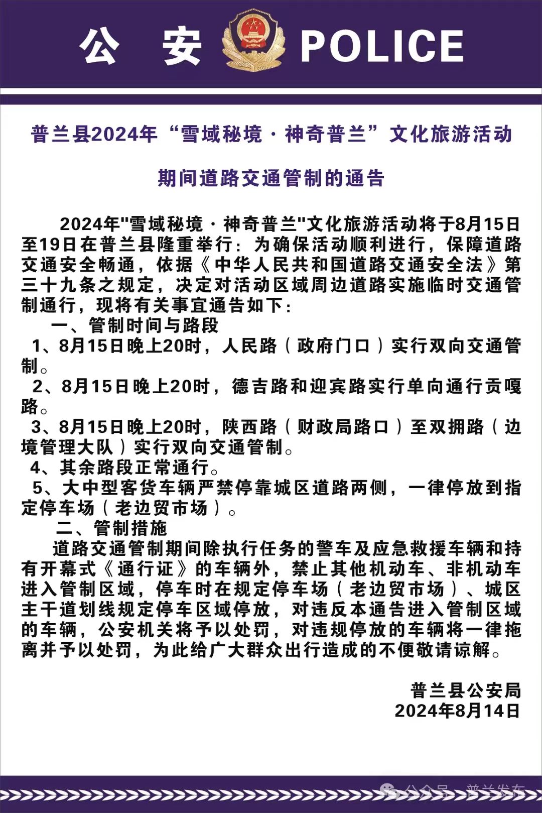2024年“雪域秘境·神奇普兰”文化旅游 活动期间部分道路交通管制通告