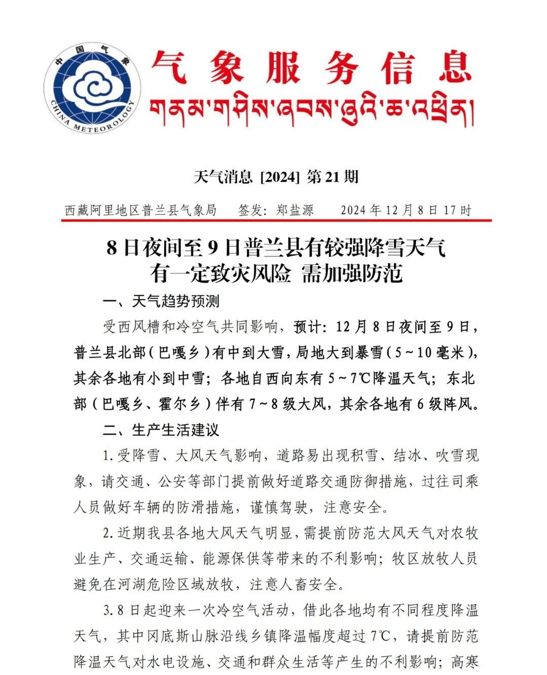 普兰县降雪、降温、大风天气消息