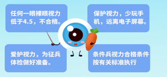 视力:任何一眼裸眼视力低于4.5,不合格。任何一眼裸眼视力低于4.8,需进行矫正视力检查,任何一眼矫正视力低于4.8或矫正度数超过600度,不合格。��屈光不正经准分子激光手术(不含有晶体眼人工晶体植入术等其他术式)后半年以上,无并发症,任何一眼裸眼视力达到4.8,眼底检查正常,除条件兵外合格。注:条件兵视力合格条件按有关标准执行。