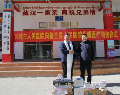 6月25日,韩城市人民医院向普兰县人民医院捐赠医疗物资仪式在普兰县人民医院大楼前举行。![]()