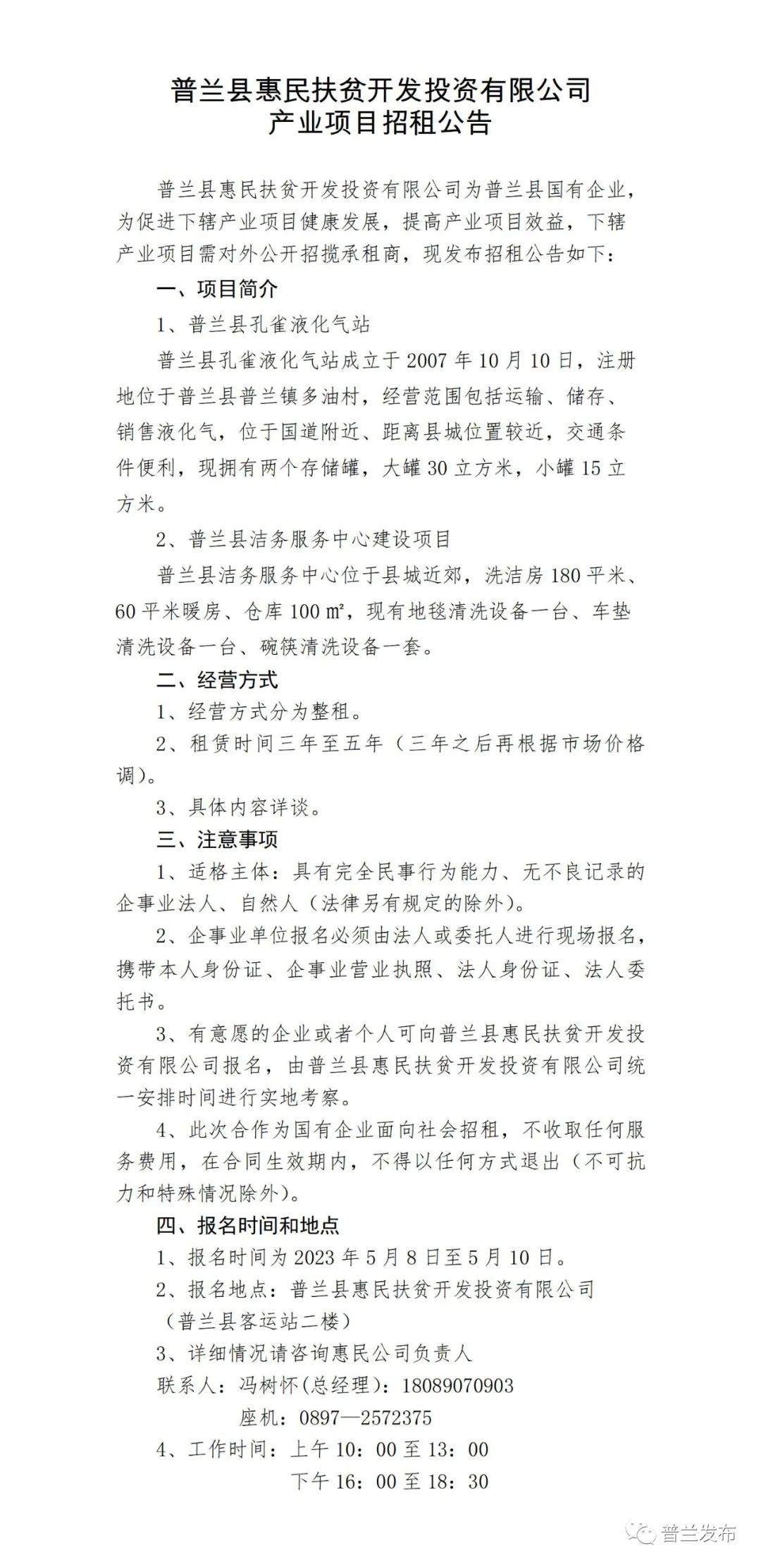 普兰县惠民扶贫开发投资有限公司产业项目招租公告