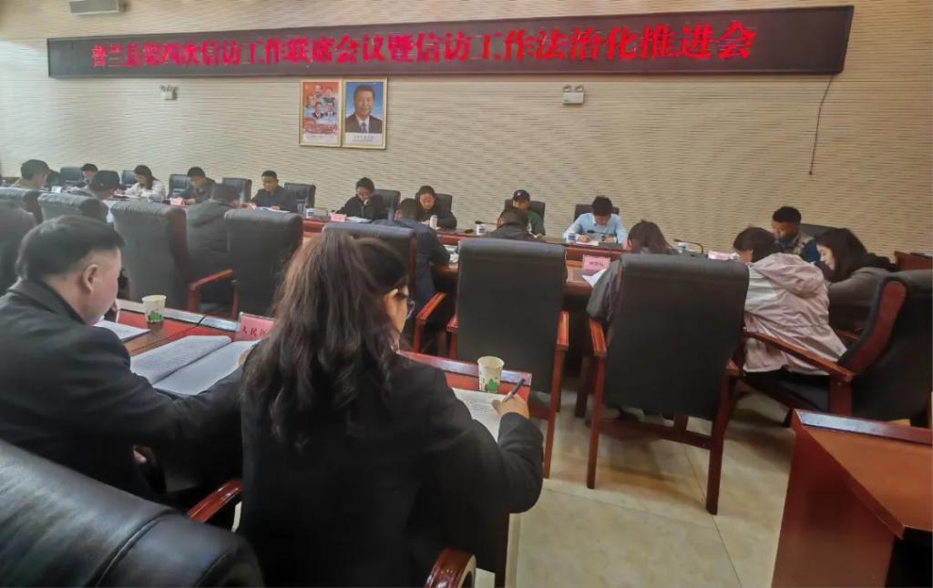 会议传达学习了中央、自治区、阿里地区信访工作联席会议推进信访工作法治化会上的讲话精神和《中共阿里地区委员会社会工作部、地区信访局关于转发〈中央信访工作联席会议办公室信访工作考核评分办法〉的通知》和《自治区信访工作考核指标解释说明》精神以及西藏自治区信访工作联席会议办公室关于转发《西藏自治区公安机关维护信访秩序法治化工作联动机制》通知精神,并研究审议《普兰县信访工作联席会议办公室〈关于深入贯彻落实关于着力推进信访工作法治化的意见〉的任务分工方案(送审稿)》《普兰县信访工作联席会议办公室组建推进信访工作法治化联络员制度(送审稿)》。