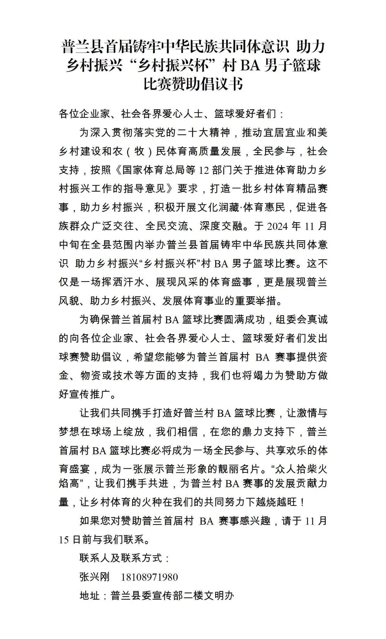 普兰县首届铸牢中华民族共同体意识助力乡村振兴“乡村振兴杯”村BA男子篮球比赛赞助倡议书