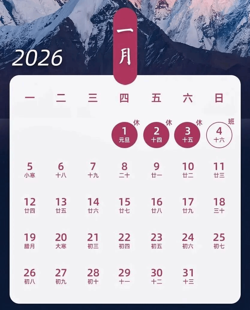 此前,国务院办公厅发布的关于2026年部分节假日安排的通知中,元旦放假安排如下:1月1日(周四)至3日(周六)放假调休,共3天,1月4日(周日)上班。