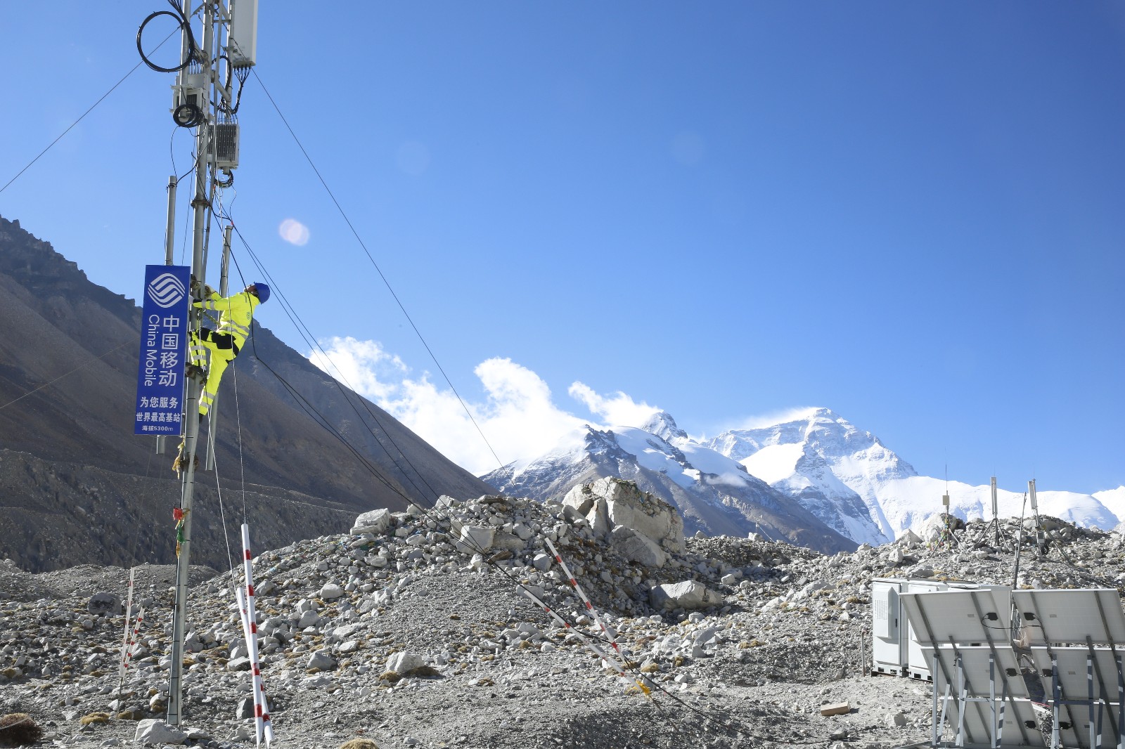 网络维护人员在珠峰大本营基站开展日常维护。
