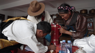 回忆起中央代表团来到家中的情景,阿旺难掩欣喜与激动,一幕幕温暖瞬间深深刻印在脑海中:在重建好的新家园内,他身着盛装,献上洁白的哈达,端上吉祥的切玛盒,将最高礼仪献给总书记派来的亲人们。那一天,他带着中央代表团的成员们一间一间参观,详细讲述如今的幸福生活。