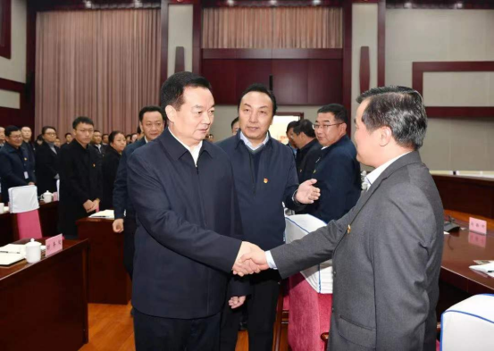 3月16日上午,自治区党委书记王君正在自治区交通运输系统调研。这是座谈会召开之前,王君正亲切看望慰问交通运输系统的干部职工。记者 旦增西旦 摄