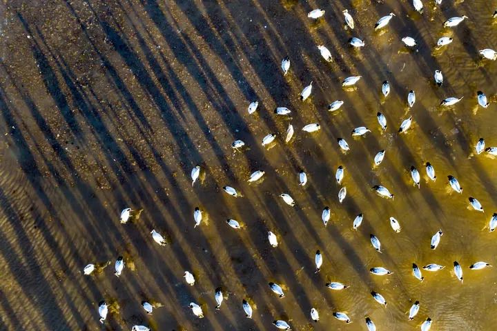 这是2023年12月5日清晨在拉萨市林周县虎头山水库拍摄的越冬黑颈鹤(无人机照片)。新华社记者 姜帆 摄