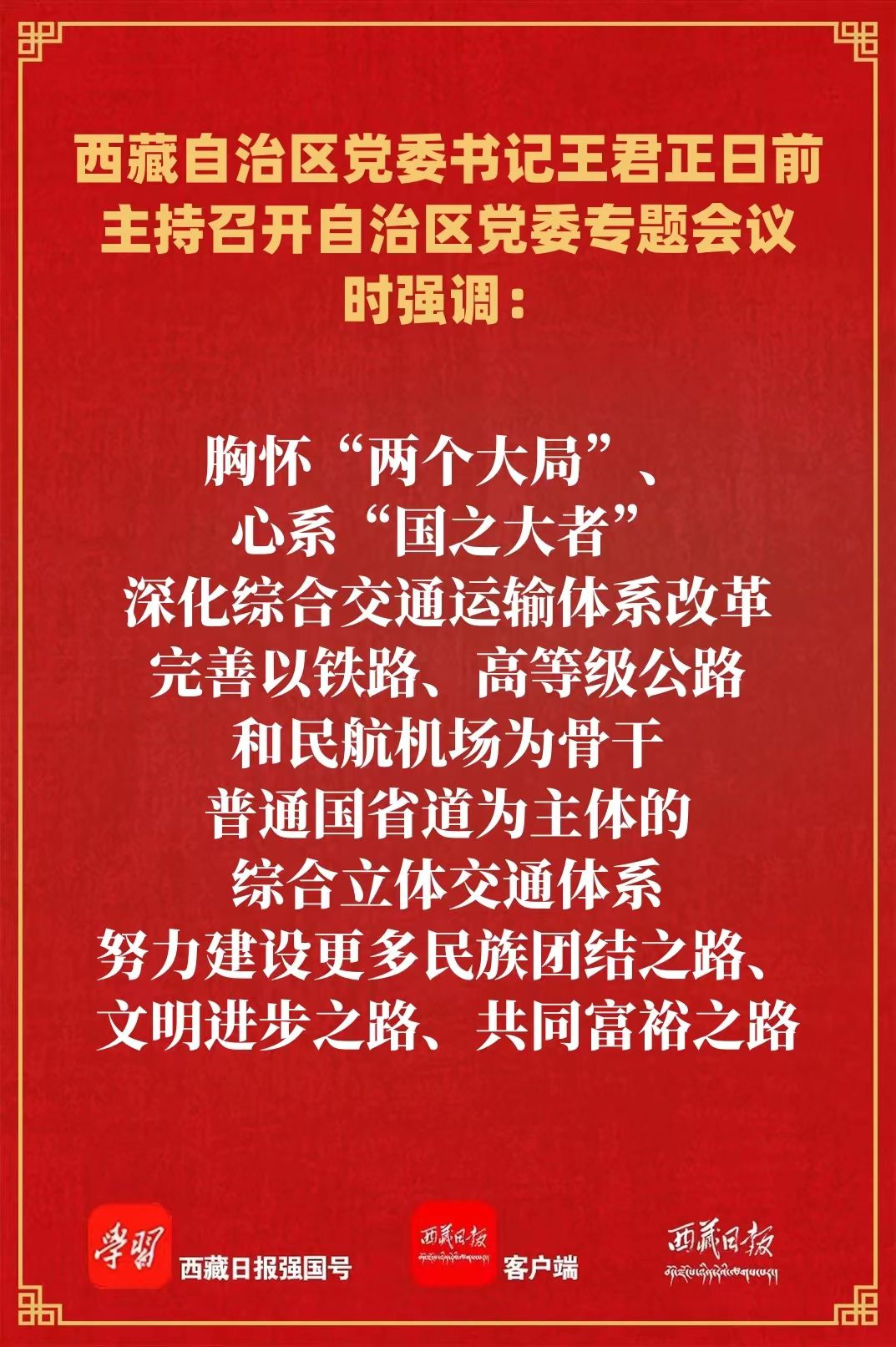 王君正强调,站在新时代新征程上,交通瓶颈依然是制约西藏经济社会发展的现实问题。全区各级各部门特别是交通运输系统要大力弘扬“两路”精神,坚定理想信念、站稳政治立场,做坚定拥护“两个确立”、坚决做到“两个维护”的忠实实践者。坚持以英雄模范为楷模为标杆,筑牢信仰之基、补足精神之钙、把稳思想之舵,坚定对马克思主义的信仰、对中国特色社会主义的信念、对实现中华民族伟大复兴的信心,始终在思想上政治上行动上同以习近平同志为核心的党中央保持高度一致。大力弘扬“两路”精神,敢于担当作为、争创一流业绩,做西藏交通运输事业高质量发展的合格建设者。胸怀“两个大局”、心系“国之大者”,深化综合交通运输体系改革,完善以铁路、高等级公路和民航机场为骨干,普通国省道为主体的综合立体交通体系,努力建设更多民族团结之路、文明进步之路、共同富裕之路,更好促进各族群众交往交流交融,推动西藏更快融入全国统一大市场。大力弘扬“两路”精神,筑牢团结意识、凝聚奋斗力量,做社会主义现代化新西藏建设的不懈奋斗者。坚持同呼吸、共命运、心连心,进一步加强和巩固民族团结,巩固和发展军政军民团结,真正做到心往一处想、劲往一处使,凝聚起磅礴力量,为推动西藏长治久安和高质量发展作出更大贡献。