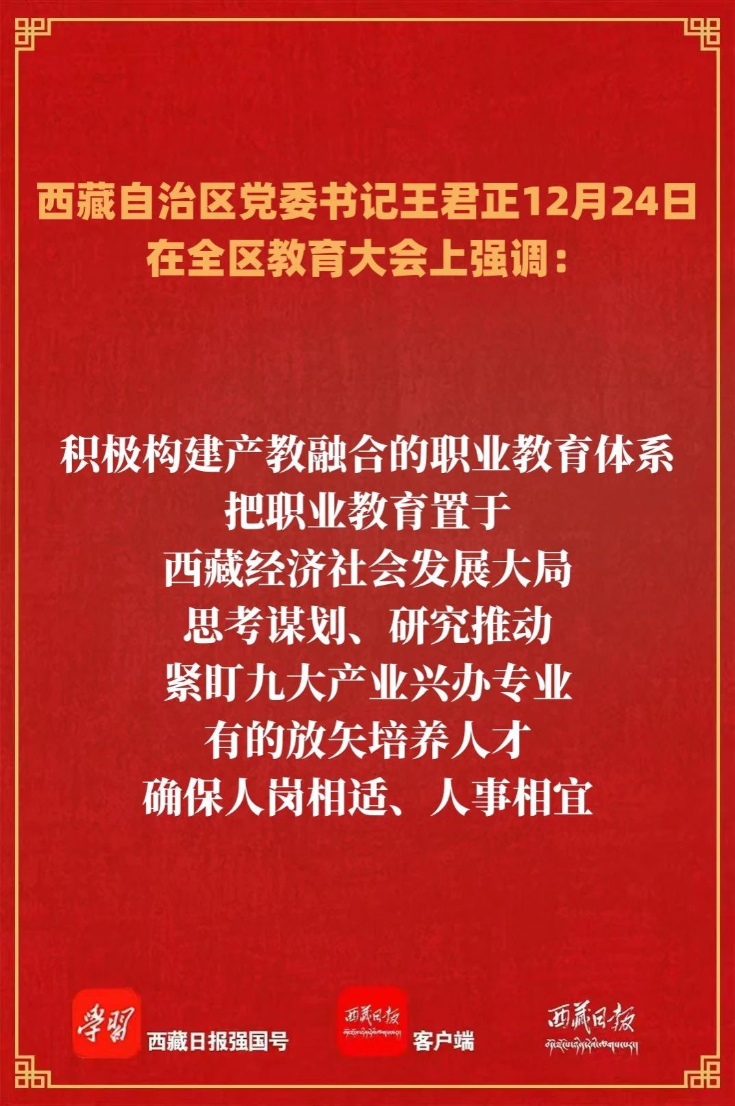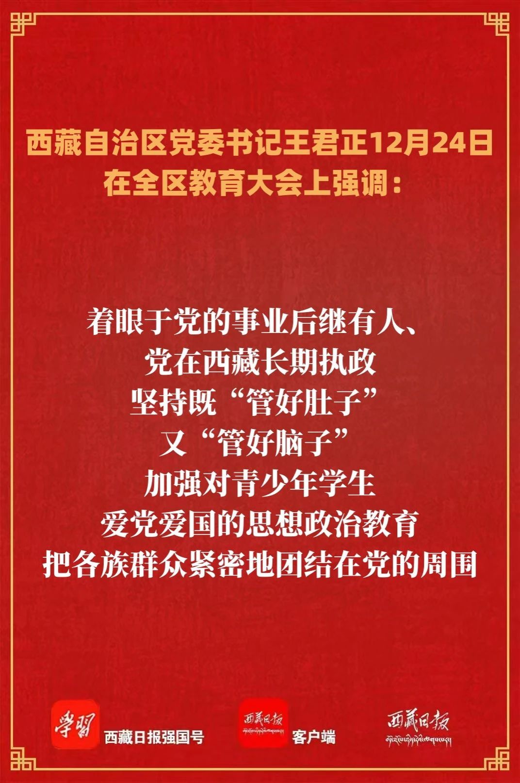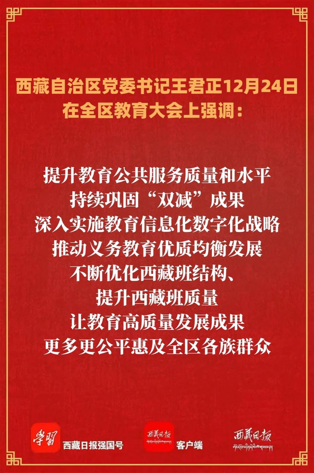 12月24日,全区教育大会在拉萨召开。自治区党委书记王君正出席并讲话。他强调,要坚持以习近平新时代中国特色社会主义思想为指导,坚决贯彻习近平总书记关于教育工作的重要指示精神,贯彻落实全国教育大会、全国高校党的建设工作会议精神,努力办好人民满意的教育,推动全区教育事业高质量发展,为建设社会主义现代化新西藏提供有力支撑。
