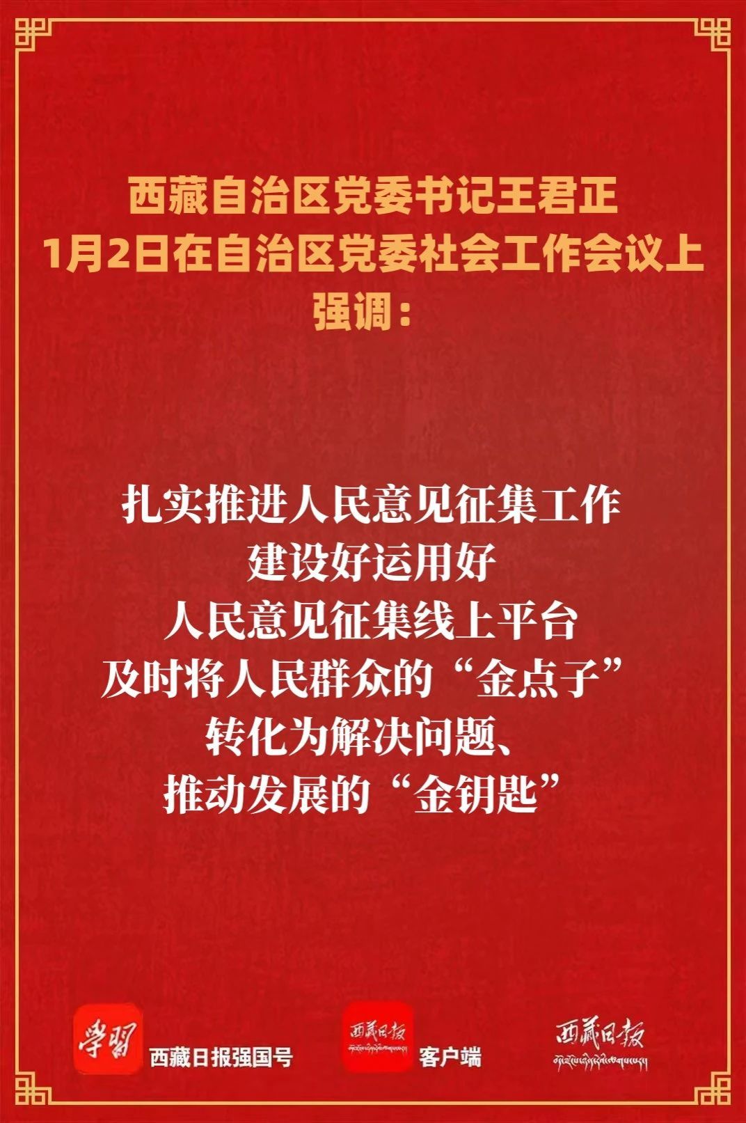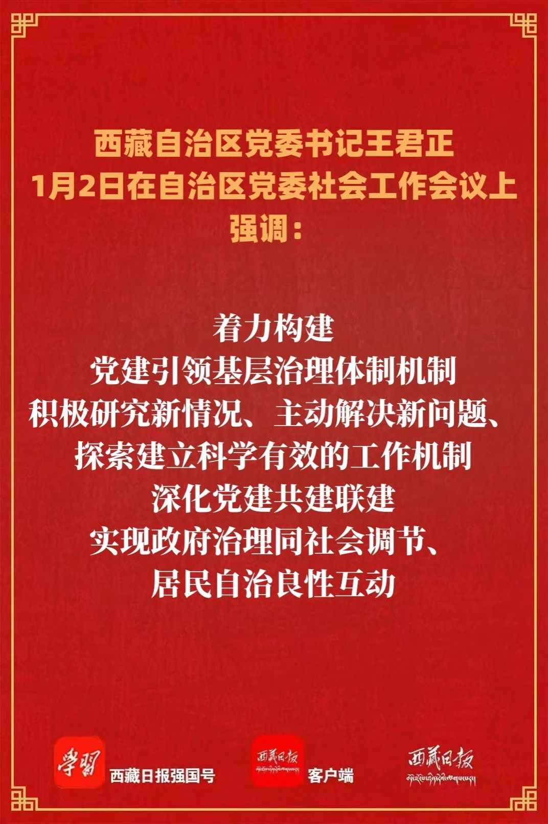 1月2日,自治区党委社会工作会议在拉萨召开。自治区党委书记王君正出席并讲话。强调,要深入学习贯彻习近平总书记关于社会工作的重要论述和重要指示精神,认真贯彻落实中央社会工作会议精神,坚定不移走中国特色社会主义社会治理之路,不断推动新时代社会工作高质量发展,为建设社会主义现代化新西藏作出更大贡献。