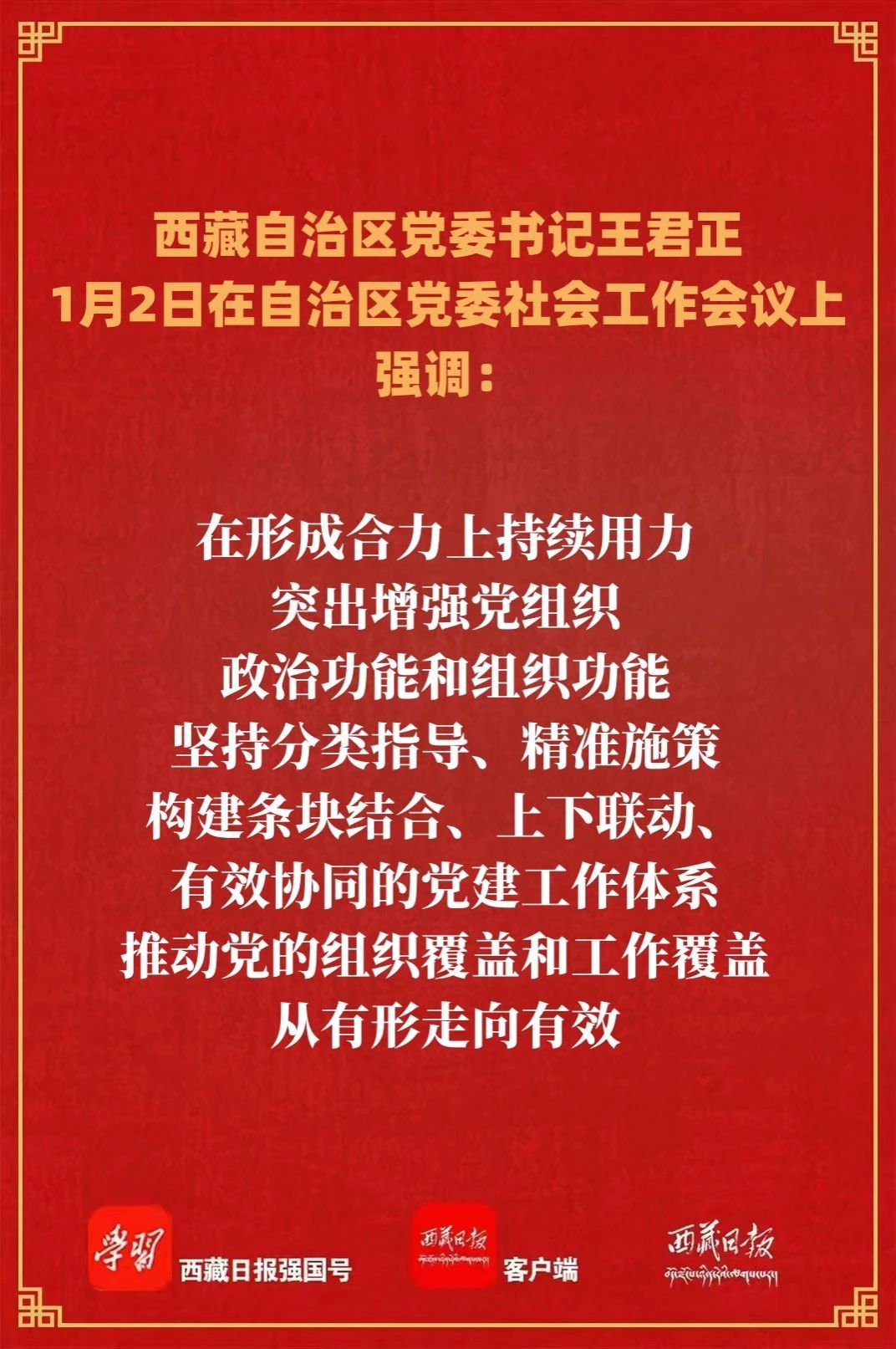 王君正强调,要坚持和加强党的全面领导,为做好新时代西藏社会工作提供坚强组织保证。强化社会工作领导责任,各级党委要扛起政治责任,把社会工作摆上重要议事日程,定期研究部署,解决重点难点问题;社会工作部门要牢牢把握政治机关定位,持续提升工作质效,努力展现新担当新作为。建强社会工作人才队伍,加强教育培训,不断提升社会工作者综合能力素质,鼓励各类人才扎根基层、治理基层、建功基层;社会工作干部要坚持求真务实、真抓实干,持续改进作风、狠抓落实,力戒形式主义、官僚主义,主动深入基层、服务群众。营造社会工作浓厚氛围,加大宣传力度,持续开展先进典型选树活动,大力营造人人关心、人人理解、人人参与、人人支持社会工作的浓厚氛围。