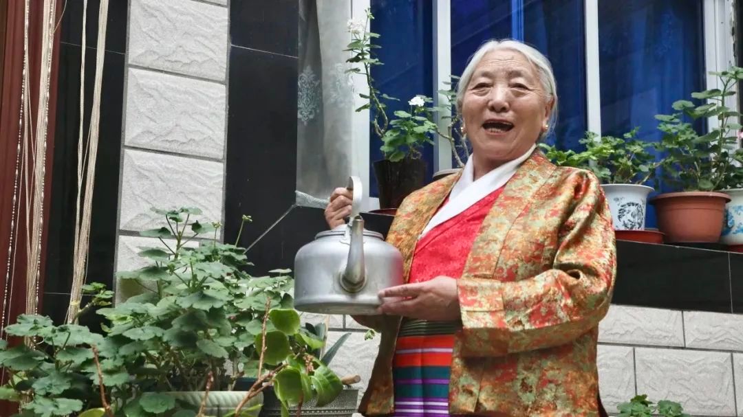 图为卓玛仁增在家中浇花。