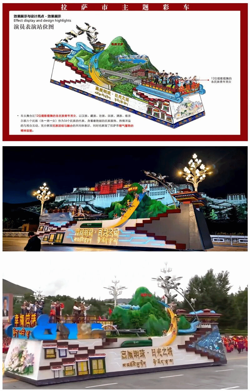 中国鼓、格桑花及和平鸽展翅翱翔,寓意和平发展的未来之路。车体两侧以长城纹搭配花束装扮,如意造型间书写“幸福西藏 扎西德勒”,飘动的彩带充满动感,彰显出朝气与活力。360名学生身着现代服饰和56个民族的传统服饰,围绕彩车载歌载舞,汇聚成欢乐的海洋,展现了西藏未来发展的美好与光明。