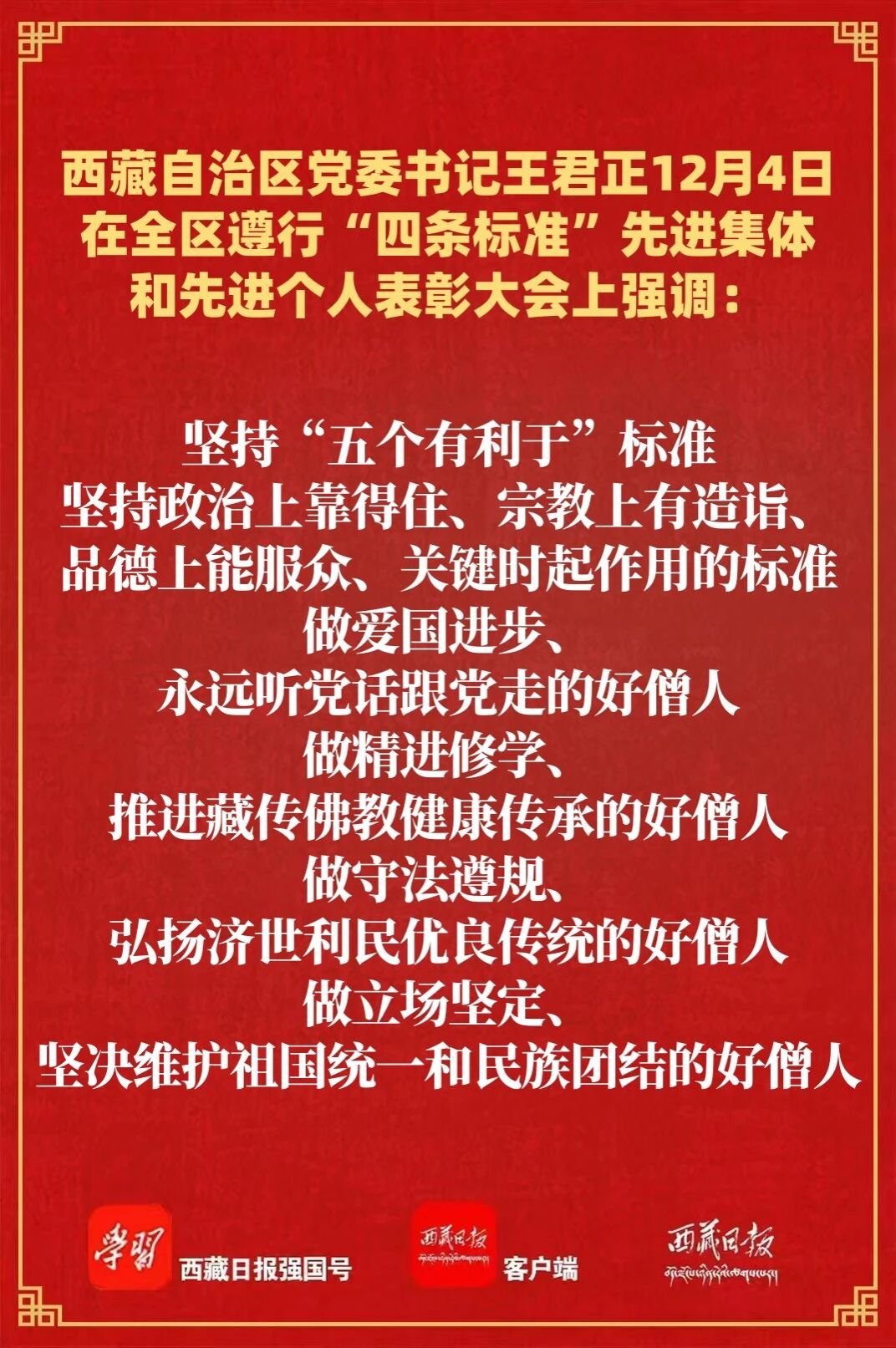 王君正强调,全区宗教界人士和广大僧尼要积极践行习近平总书记重要指示,坚持“五个有利于”标准,坚持政治上靠得住、宗教上有造诣、品德上能服众、关键时起作用的标准,做爱国进步、永远听党话跟党走的好僧人,做精进修学、推进藏传佛教健康传承的好僧人,做守法遵规、弘扬济世利民优良传统的好僧人,做立场坚定、坚决维护祖国统一和民族团结的好僧人,努力在促进民族团结、宗教和顺、西藏稳定发展进步中作出更大贡献。在爱国爱教、崇尚和谐上作标杆,衷心拥护中国共产党的领导,拥护社会主义制度,自觉维护祖国统一、民族团结,做到政治上靠得住。在修身立德、提高修为上作示范,潜心向学,弘扬佛法,深入研习宗教经典,娴熟掌握宗教仪轨,不断提升宗教修养,做到宗教上有造诣。在遵守法律、严守戒律上作表率,积极参与“学法规、守戒律、重修为、树形象”教育活动,秉持以戒为师的优良传统,用寺规戒律严格要求自己,做到品德上能服众。在护国利民、维护稳定上作贡献,进一步铸牢中华民族共同体意识、推进中华民族共同体建设,在大是大非面前立场坚定、旗帜鲜明,促进宗教和顺、社会和谐、民族和睦,做到关键时刻起作用。切实增强主人翁精神,参与社会主义现代化新西藏建设,紧紧围绕稳定、发展、生态、强边四件大事落实,推进“四个创建”取得新进展,为西藏更加美好的明天而不懈奋斗。