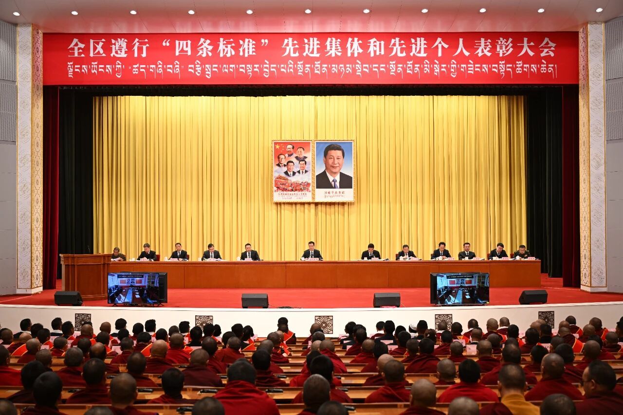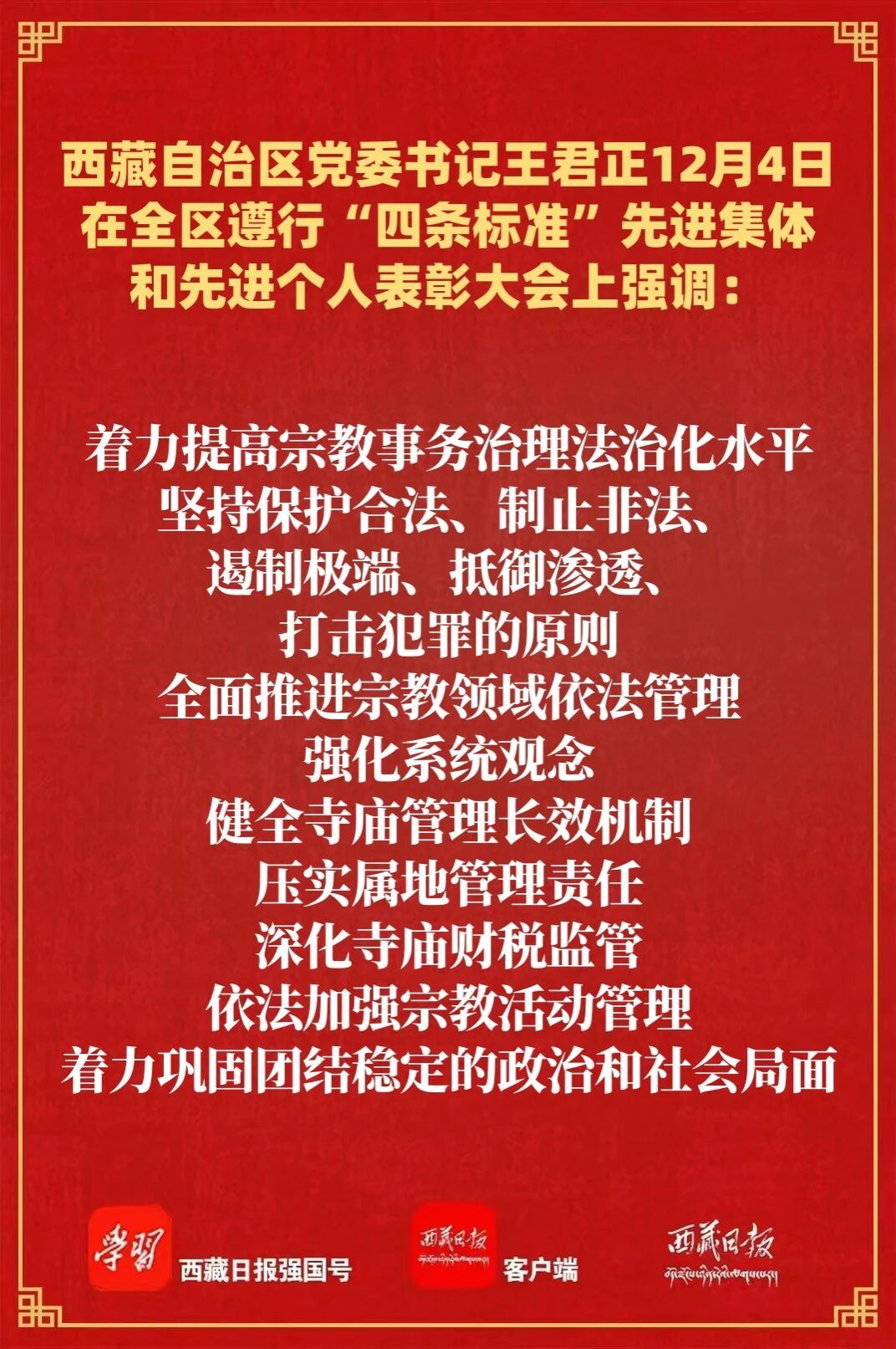 12月4日,全区遵行“四条标准”先进集体和先进个人表彰大会在拉萨举行。自治区党委书记王君正出席并讲话,强调要深入学习贯彻党的二十届四中全会精神,贯彻落实习近平总书记关于宗教工作、西藏工作的重要指示和新时代党的治藏方略,贯彻落实习近平总书记视察西藏时的重要讲话精神,按照自治区党委十届九次全会部署要求,突出分类指导,强化典型引领,积极推进藏传佛教中国化,努力为建设社会主义现代化新西藏凝聚力量。