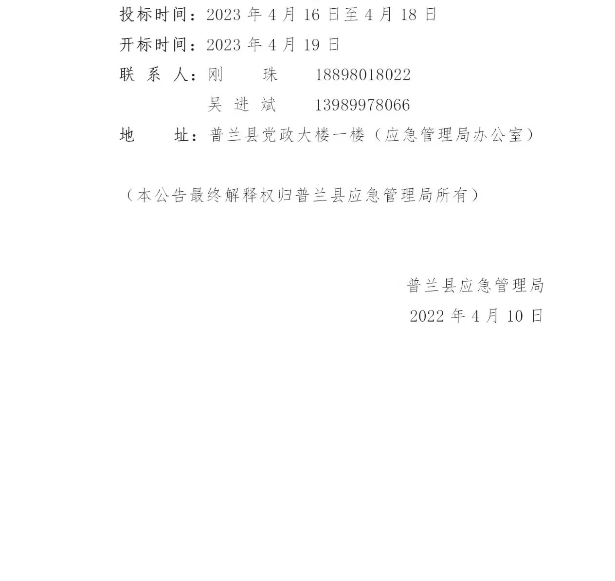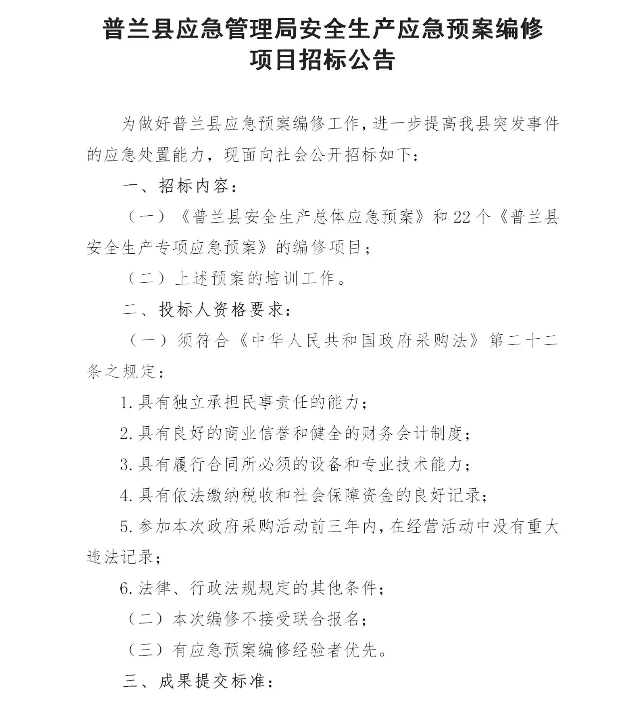 普兰县应急管理局安全生产应急预案编修项目招标公告