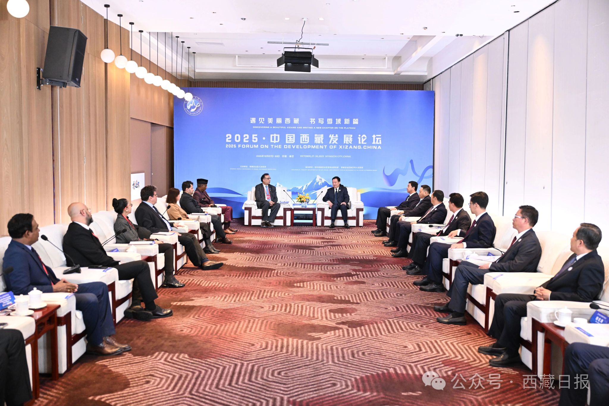 2025•中国西藏发展论坛系列活动10月27日至30日在林芝举办。28日,自治区党委书记王君正在林芝会见参加本次论坛的外国政要和驻华使节。这是会见现场。记者 旦增西旦 摄